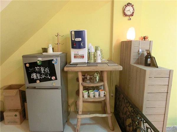這裡有杯子開飲機也有礦泉水可自行取用