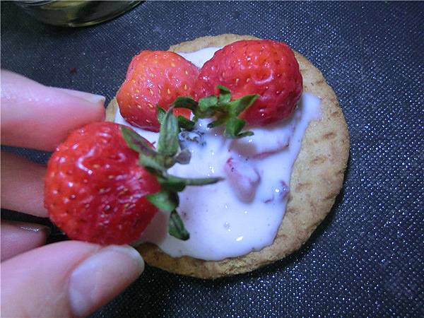 再把切半的草莓放上
