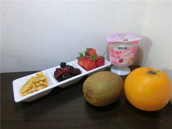 備齊草莓.奇異果.優格.柳橙.穀片.葡萄乾。