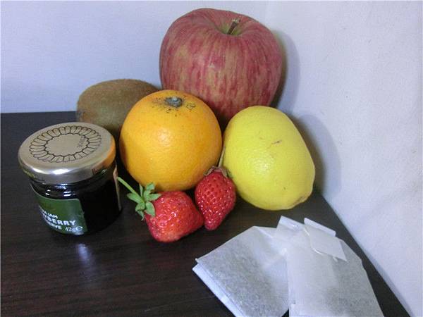蘋果。奇異果。柳橙。檸檬。金桔。莓草。果醬和茶包。