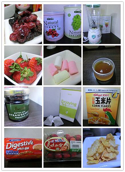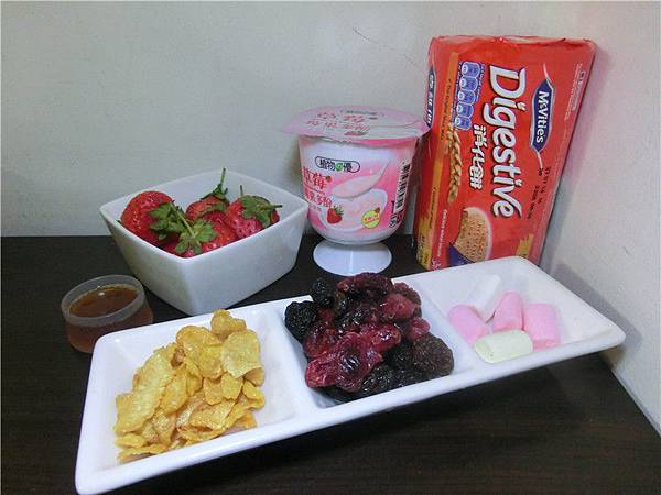 消化餅。優格。草莓。莓果(我自己是用莓果乾)。穀片。綿花糖