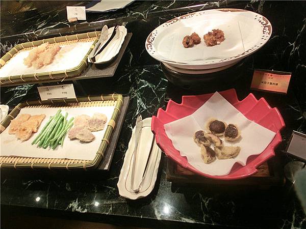 炸蝦.蝦地瓜.四季豆.芋頭以及炸雞肉和香菇