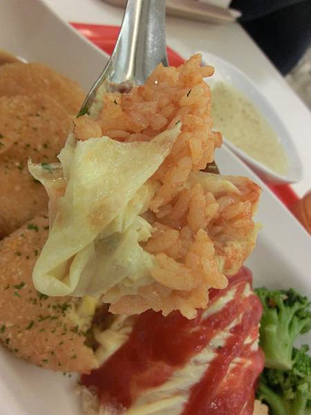 在蛋包飯裡面的白飯炒過蕃茄醬吃起來