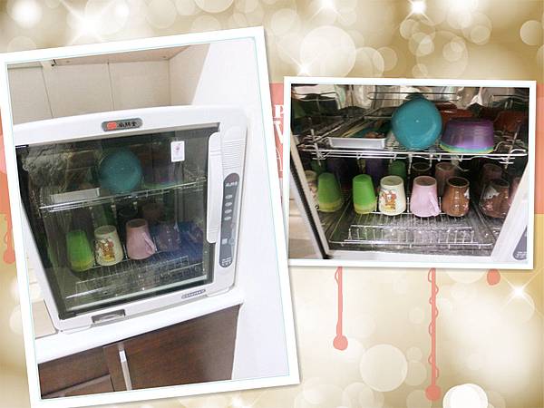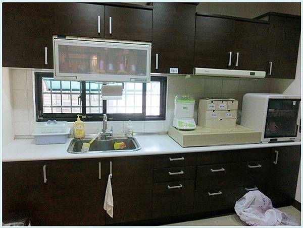 有一個明亮乾淨的廚房,洗奶瓶的器具或洗劑.烘奶器都備好了.