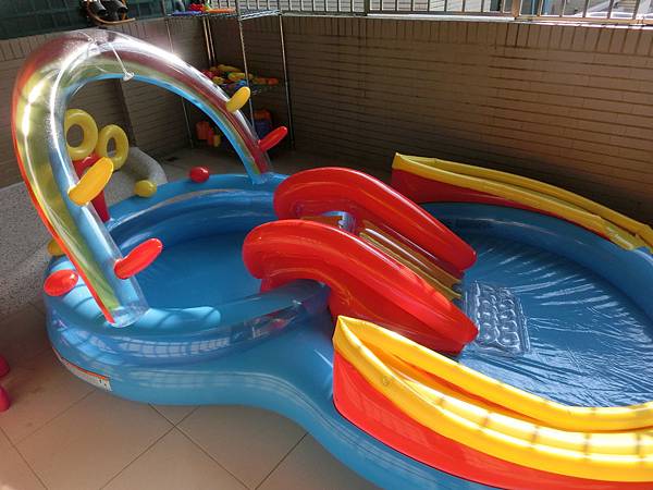 屋外還有水池有附滑水道讓小朋友也能清涼,
