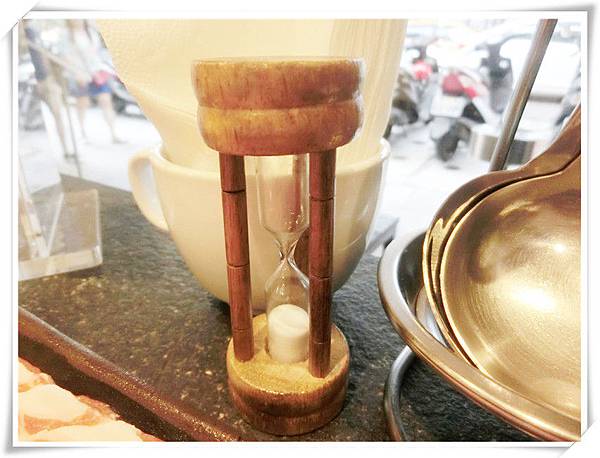 一旁的沙漏就是三分鐘,看著沙漏漏完