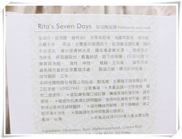 Rita’s Seven Days的玻尿酸面膜
