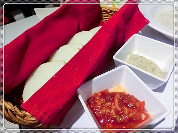 麵包是用紅色布包好,很精緻有高級西餐廳感覺,