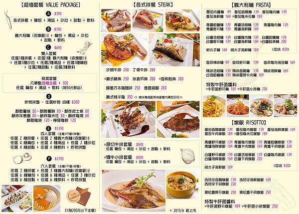 詳細的菜單有麵類排餐和飲料點心,