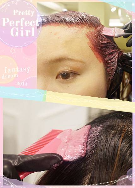 粉紅色的染劑刷到頭髮上,