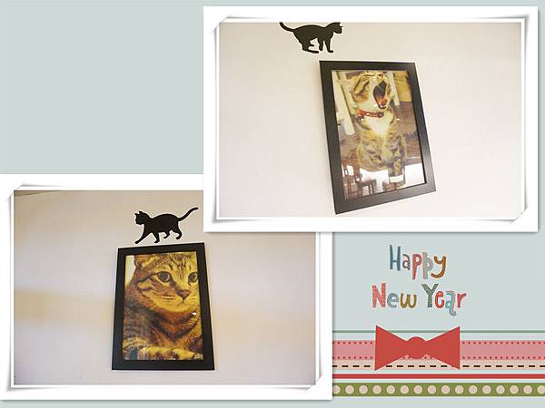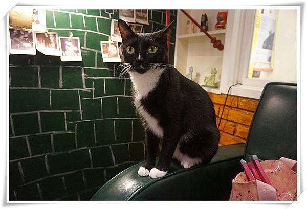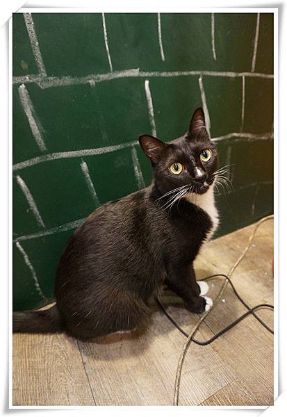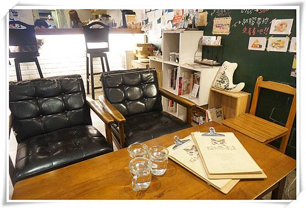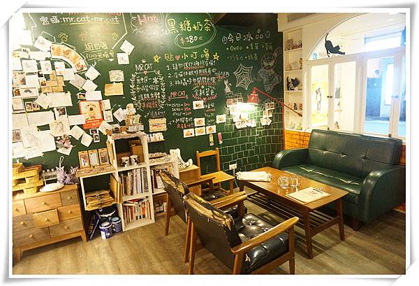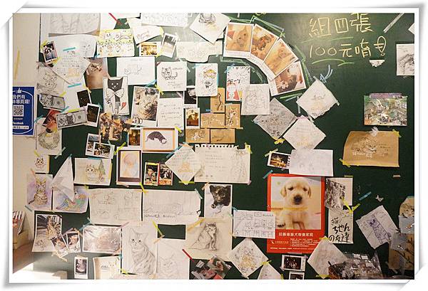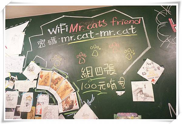 一旁的黑板上有貼好多貓咪畫像,