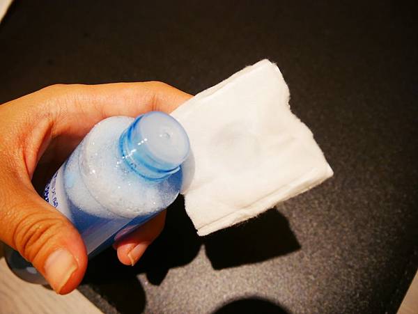 將化妝綿上倒一些雪芙蘭眼唇卸妝液