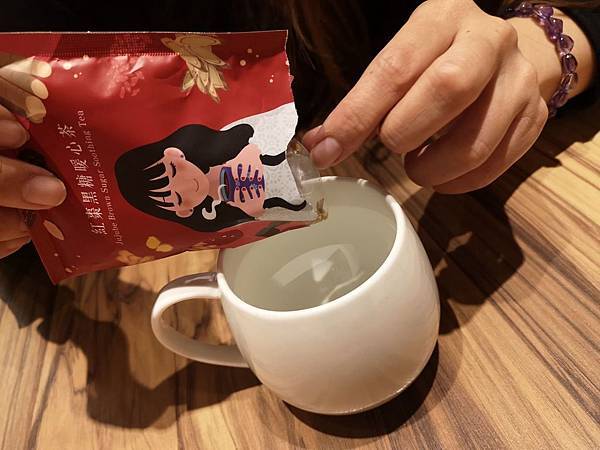裡面有一個茶包還有黑糖粉跟紅棗顆粒,