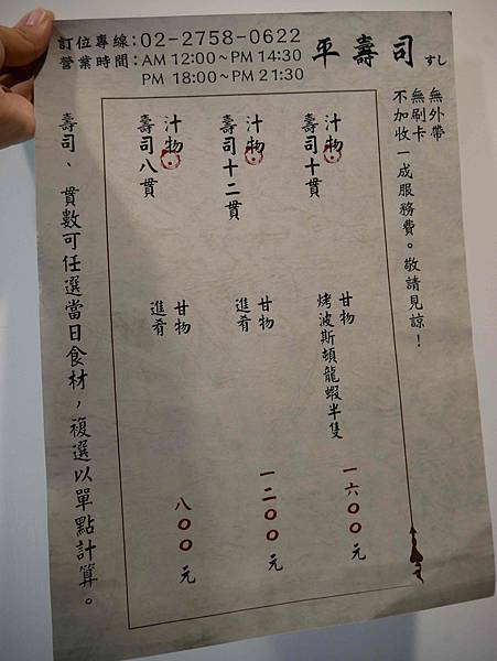 用餐完可追加每一貫收一百元,不能點重覆餐點。