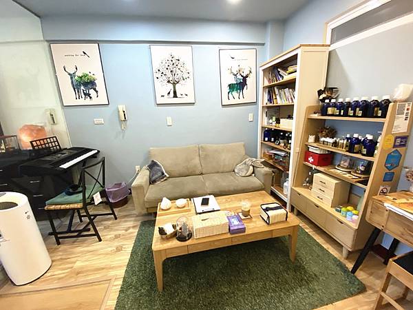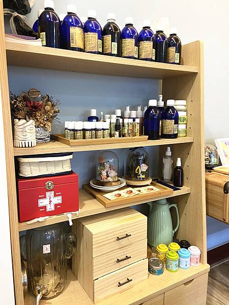 一旁有滿滿的各式芳療用精油,