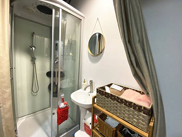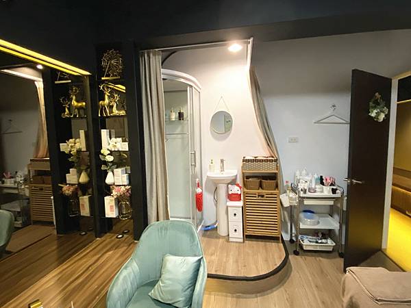 有美容床也有諮詢桌以及沖澡的淋浴間,