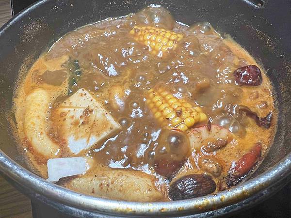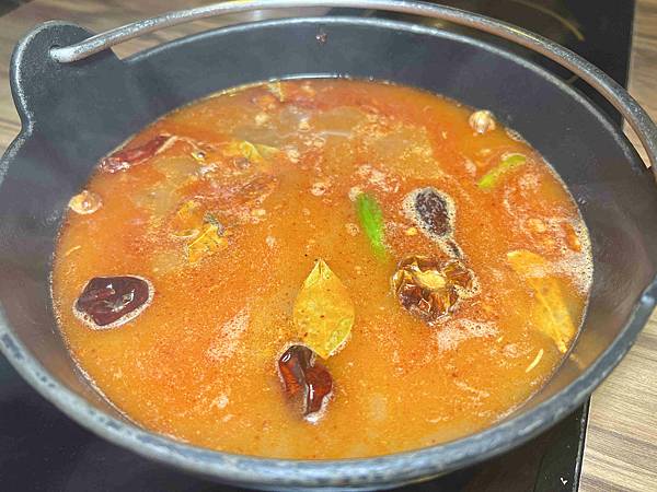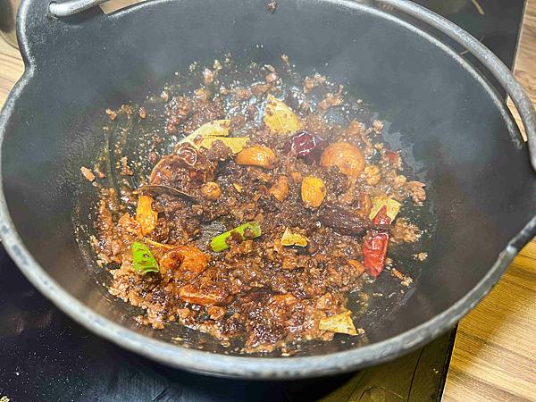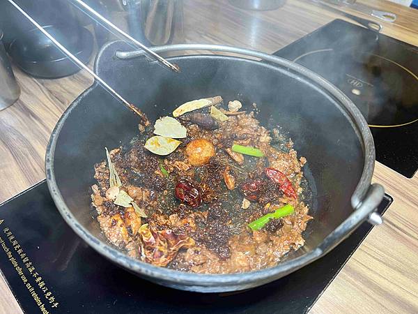 使用了紅棗和蒜頭等爆炒湯底桌邊現炒,