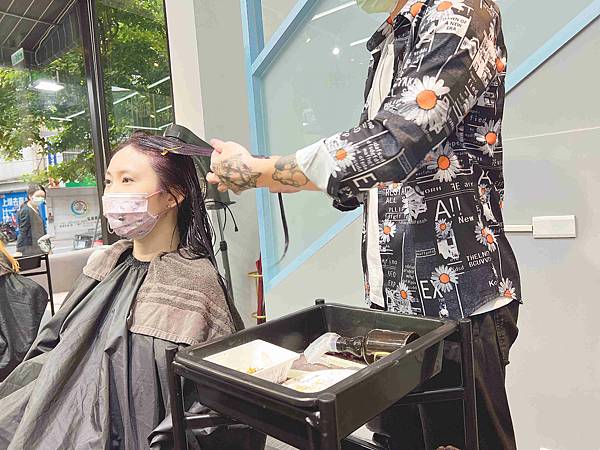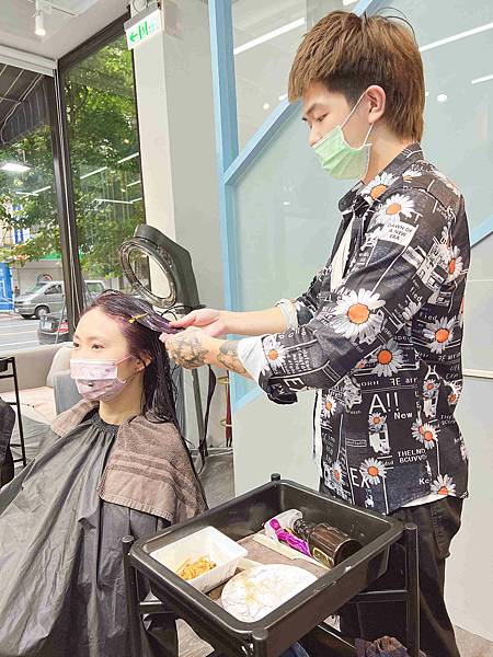 造型師細心均勻的幫忙刷上髮絲。