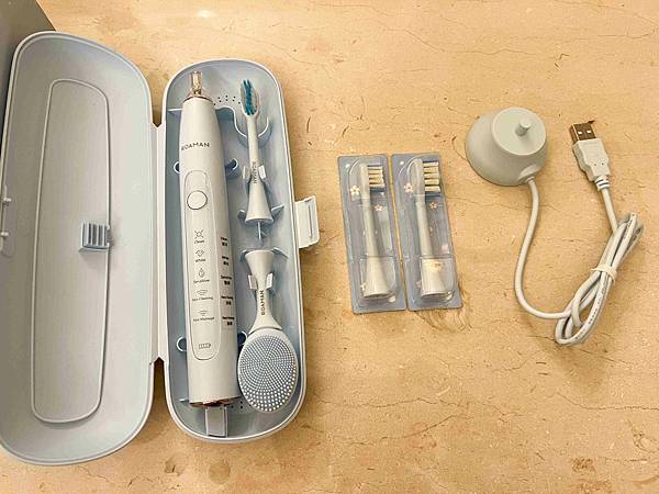 打開包裝盒子可以看到除了潔牙機,